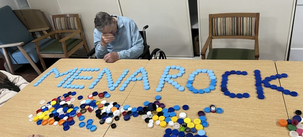 A. Absolutely, the residents at Menarock Aged Care and the volunteers who produced the photos: 15 hours collecting, washing, and sorting 15kg of lids.
