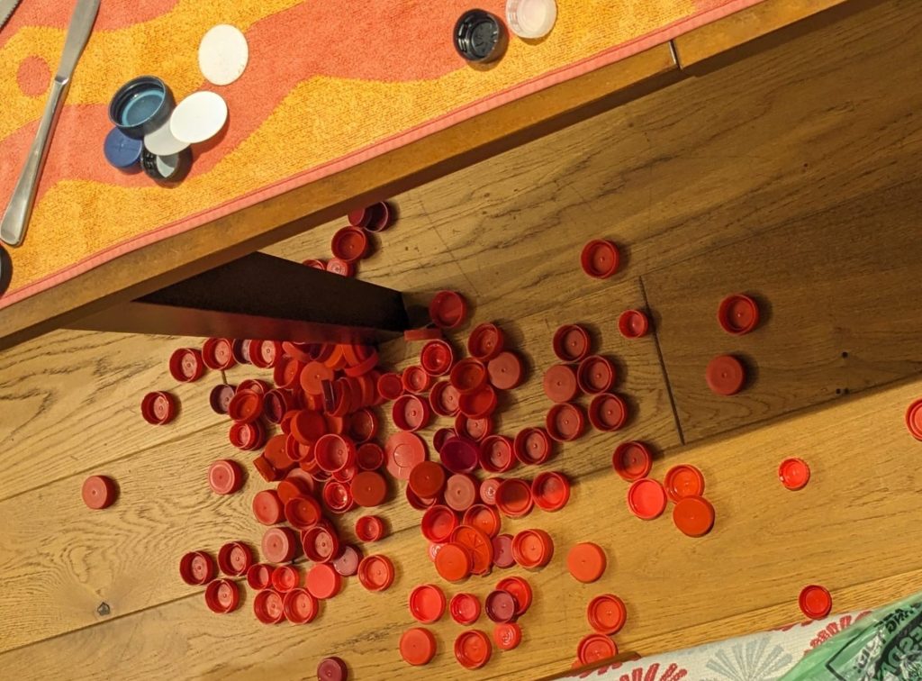 So, collect your bottle lids from milk, tetra, soda and water bottles, clean them, removing liners and stickers and invite your friends to a sorting party. Conversation will inevitably turn to the lids: